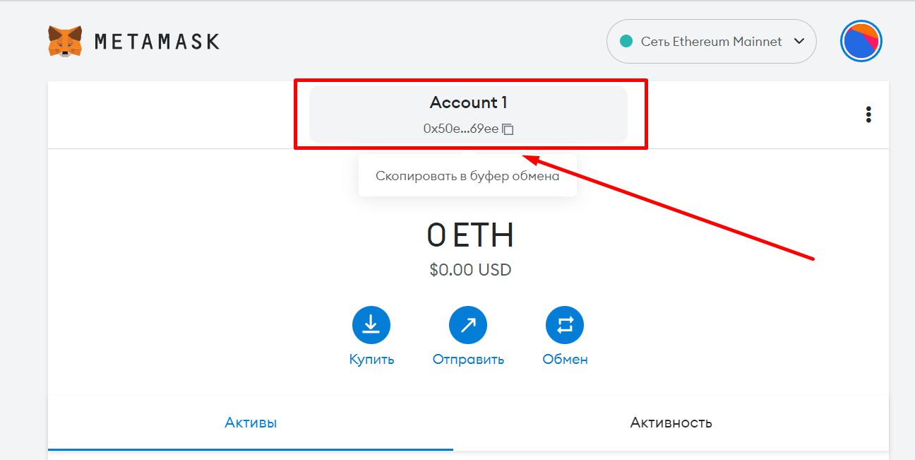 - После подтверждения того, что вы сохранили seed-фразу, кошелек создаст вашу учетную запись и тем самым сгенерирует ваш публичный и приватный ключ. Узнать приватный ключ можно, скопировав его в буфер обмена, кликнув по его сокращению вверху экрана.