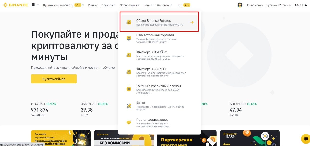 - Войдите в свой аккаунт на бирже Binance, откройте вверху экрана вкладку «Деривативы» и выберите раздел «Обзор Binance Futures».