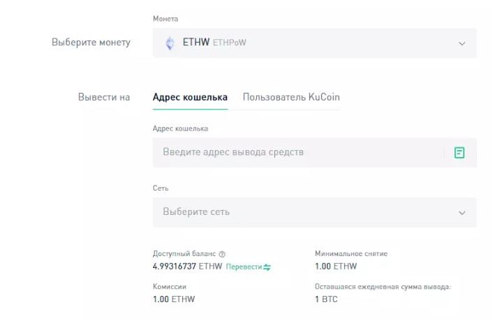 Вывод средств с KuCoin возможен как в криптовалюте на кошелек, так и в фиате на банковскую карточку. Сама процедура снятия средств простая.