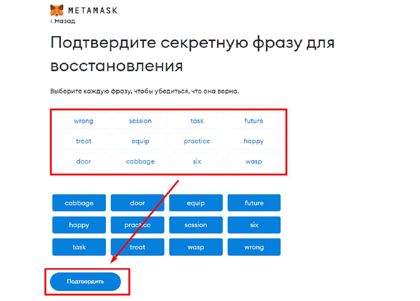 - Запишите seed-фазу из 12 случайных слов. Она нужна для восстановления доступа к кошельку. Обязательно запишите ее и сохраните в надежном месте. Лучше записать ее на бумагу и положить в сейф.