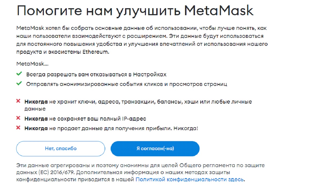 - Определитесь, нужно ли разрешать MetaMask отслеживать некоторые ваши данные для улучшения работы кошелька.