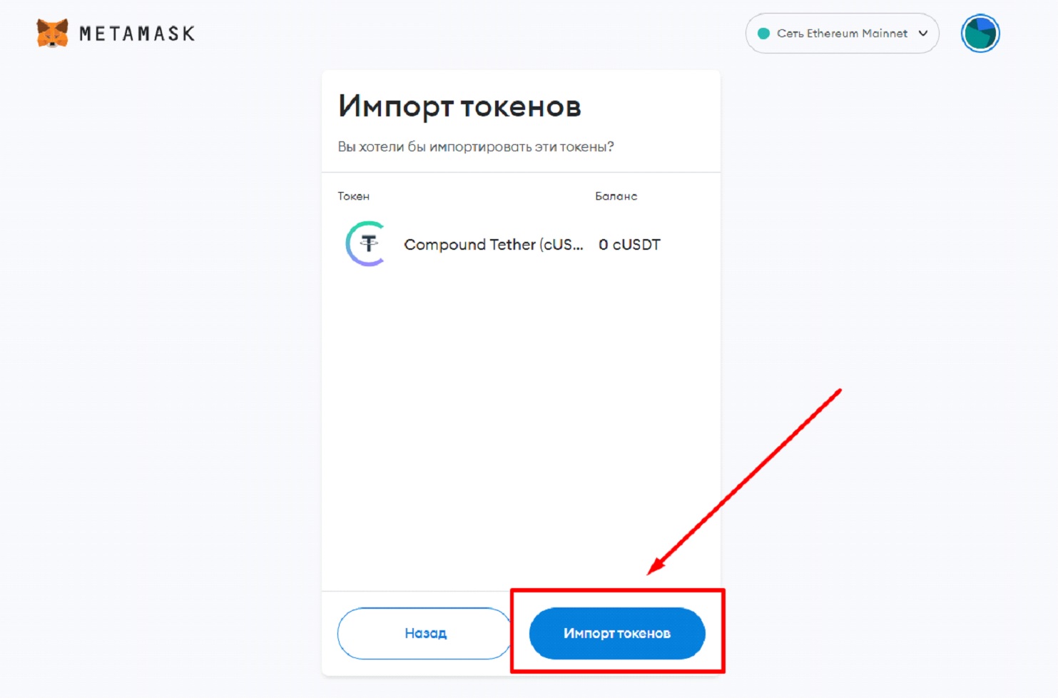- Укажите в строке поиска название нужного вам токена, например «cUSDT». Выберите его в всплывающем меню и кликните «Далее».